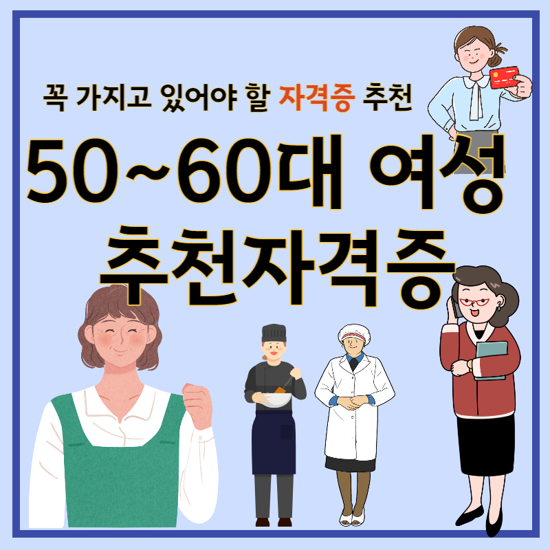 은퇴 후에도 취업을 원하시는 분들이 많습니다. 요즘 취업이 어려운 시대에 나이가 많아질수록 아무래도 취업이 힘든 데다가 특히나 여성분들은 남성분들에 비해서 직업의 종류도 한정적이어서 더욱 힘듭니다. 그래서 오늘 50대 60대 이상 여성분들이 꼭 따야 할 자격증 5가지 +1가지 더 해서 6가지를 알려드리려고 합니다.