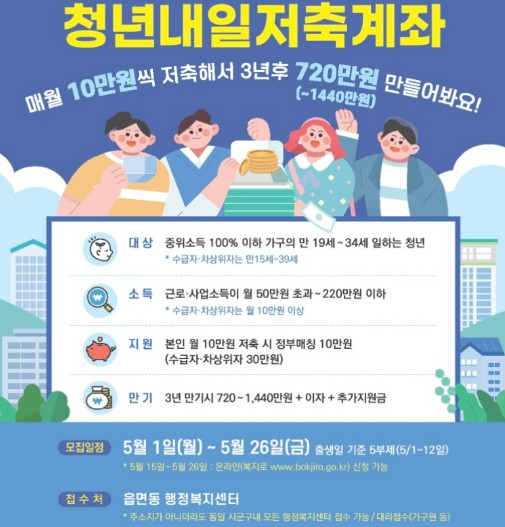 청년내일저축계좌는 젊은이들이 장래를 위해 준비하는 매우 유용한 상품입니다. 신청 기간은 5월 26일까지이니 아직 신청하지 않으신 분들은 서둘러야 합니다. 이 상품은 매월 10만 원씩 저축하면, 정부의 지원으로 최소 720만 원부터 최대 1,440만 원까지의 금액을 만들 수 있습니다. 청년들이 저축을 통한 자산 형성을 지원받아 교육, 주거, 창업 등 미래에 투자하고 위기에 대비할 수 있도록 돕는 목적을 가지고 있습니다. 저축계좌를 신청하실 때는 자격 조건, 내용, 신청 방법 등에 대해서도 확인하시길 바랍니다.